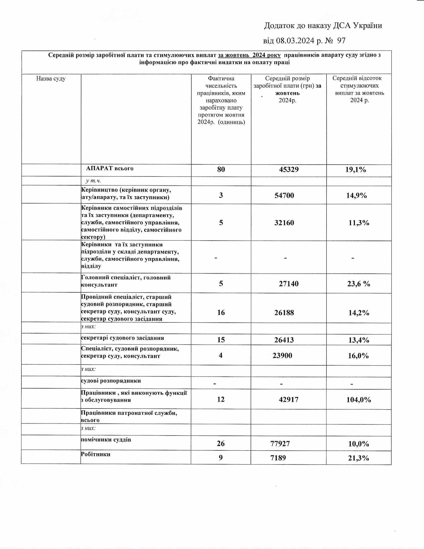 Інформація про середній розмір заробітної плати та стимулюючих виплат працівників апарату суду